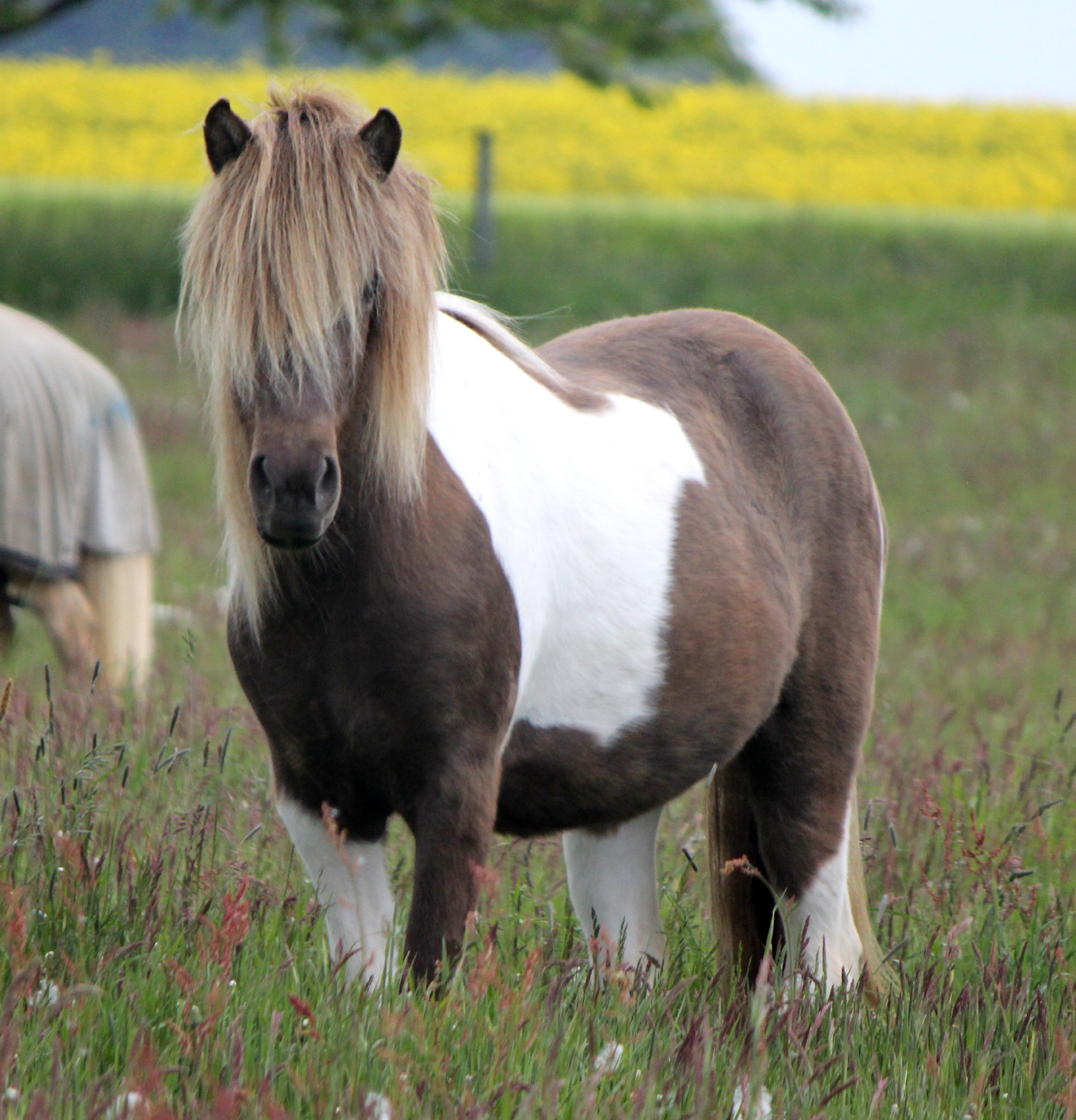 Hamingja ist die Tochter von Hringja, einer Smoky Cream Scheckstute die wir 2017 verkauft haben. Von ihr hat Hamingja auch die besondere Lackierung vererbt bekommen. Sie ist nämlich genetisch gesehen eigentlich ein Rappschecke, erscheint durch ein Aufhellungsgen jedoch eher schokofarben mit blonden Spitzen in der Mähne. Hamingja ist groß gebaut und sehr elegant mit ihren langen, schlanken Beinen. Sie hat obendrein noch viel Langhaar in die Wiege gelegt bekommen und ist dadurch einfach wunderhübsch.